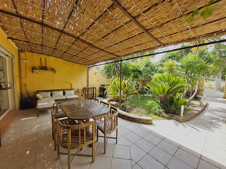 À l’extérieur, une terrasse ombragée prolonge l’espace avec un salon d’été pour y prendre l'apéritif, une grande table, idéale pour des repas grillades à la plancha.